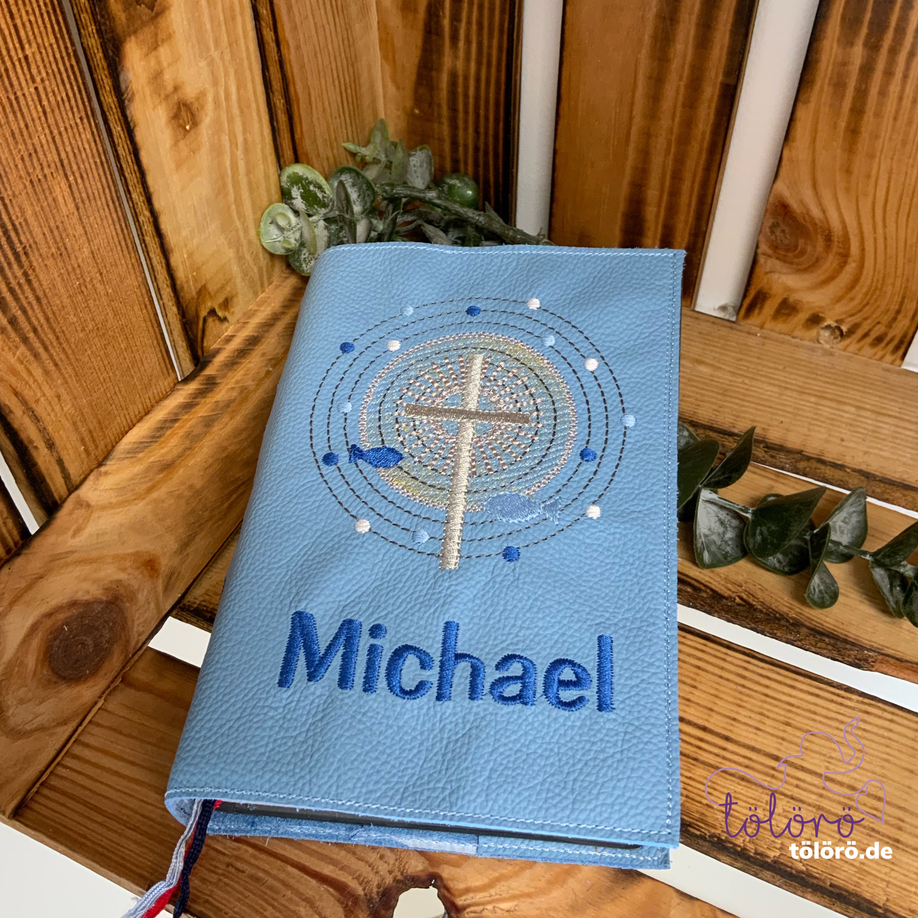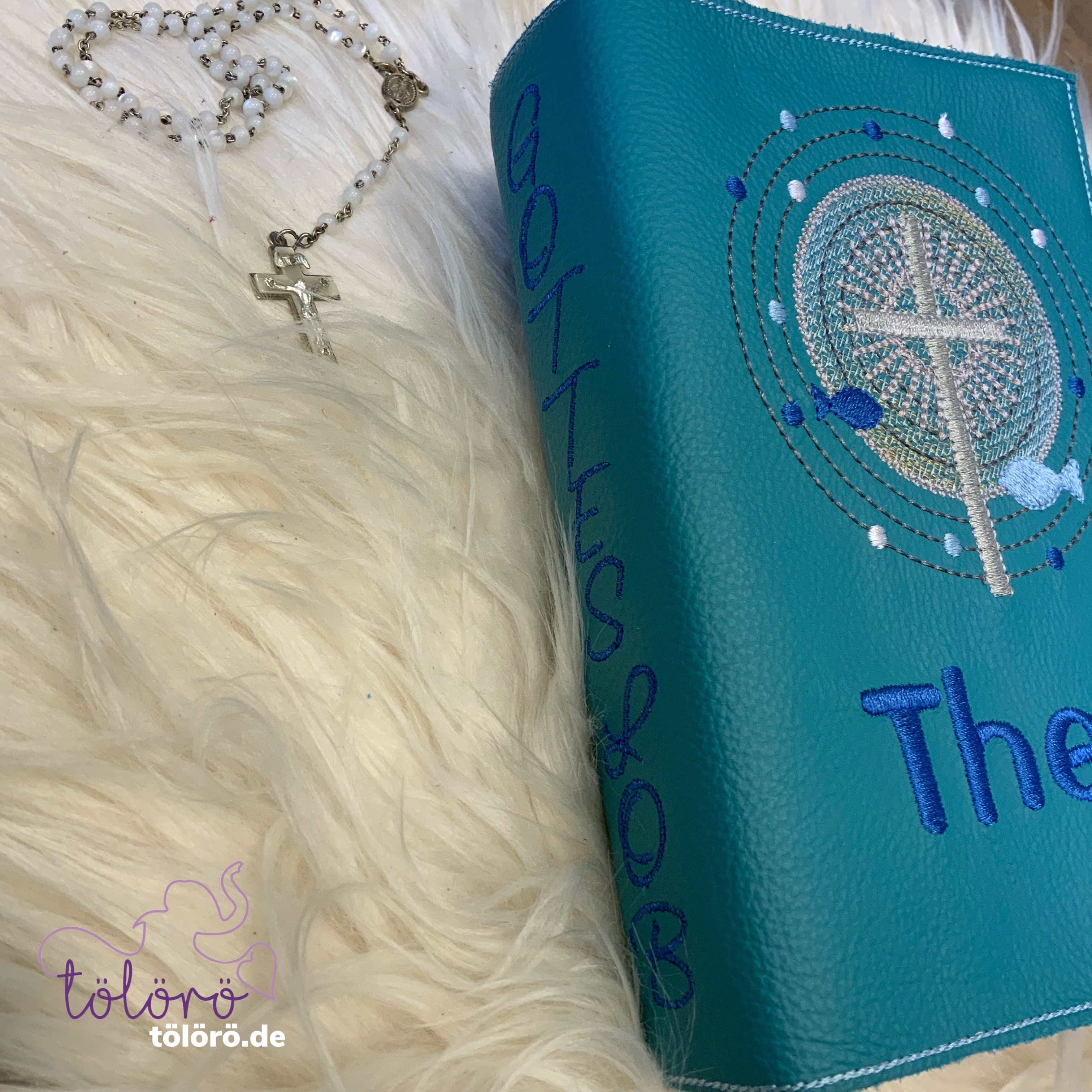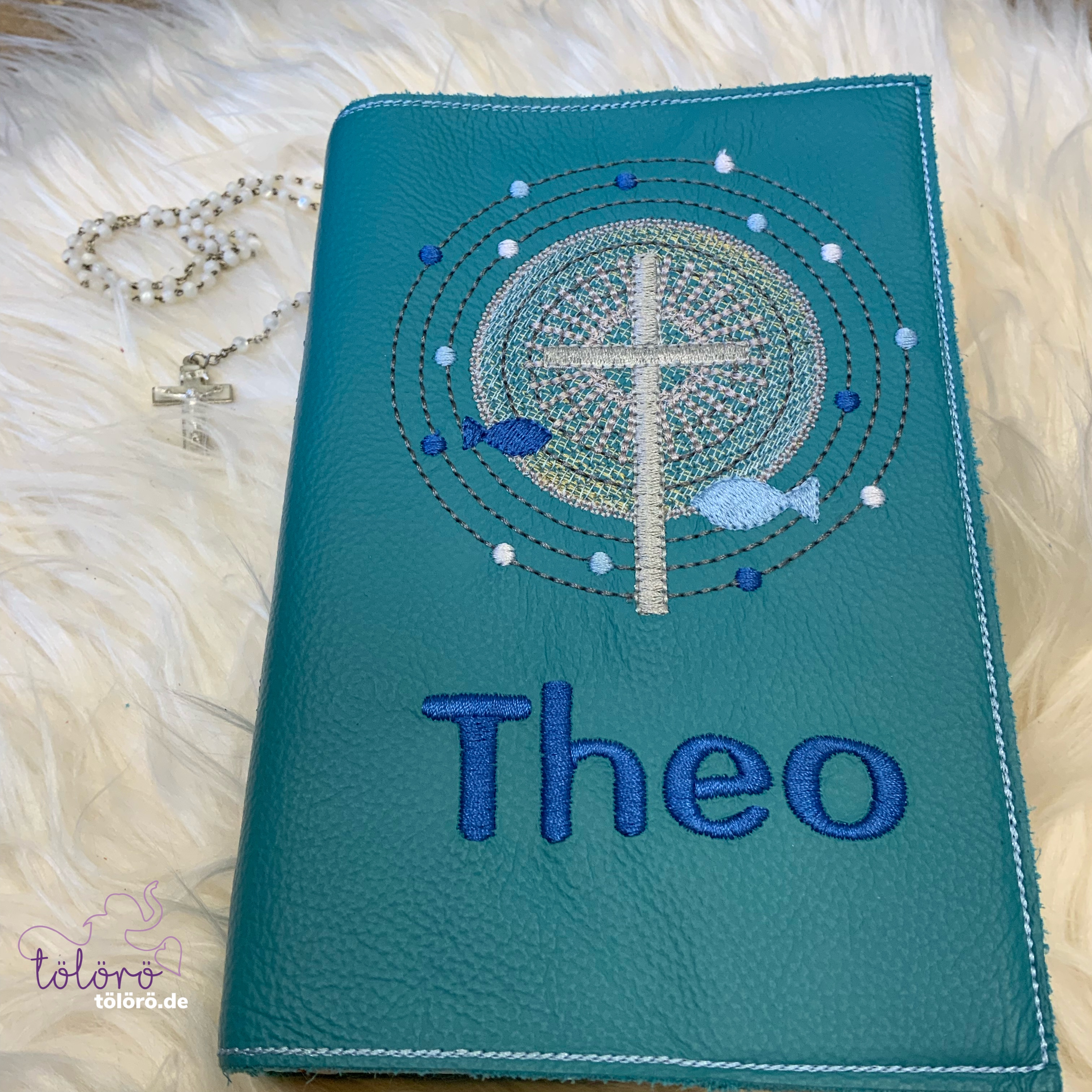 Gotteslobhülle Kreuz mit großem Lichtkreis und Fische petrol