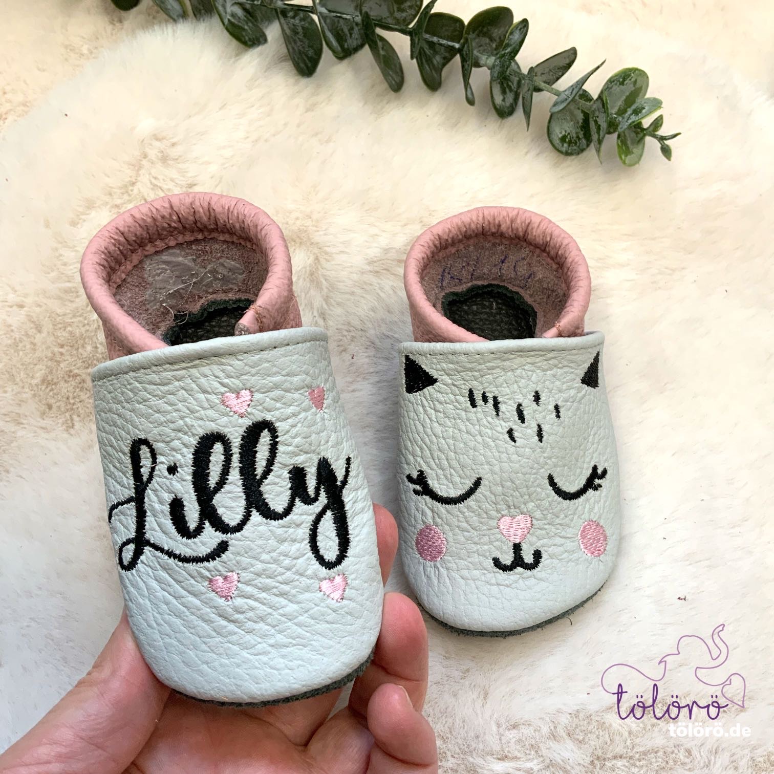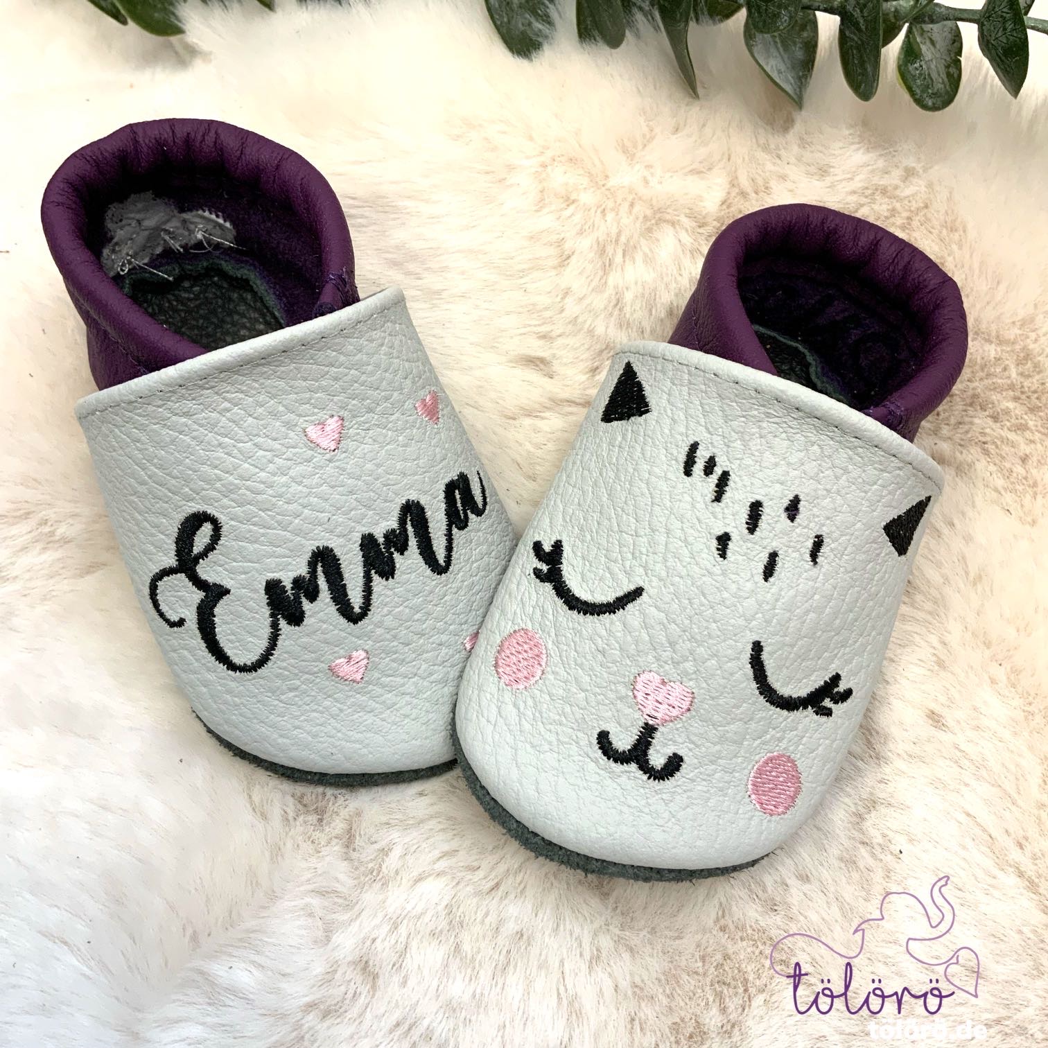 Beispiel Emma Kappe hellgrau, Ferse lila