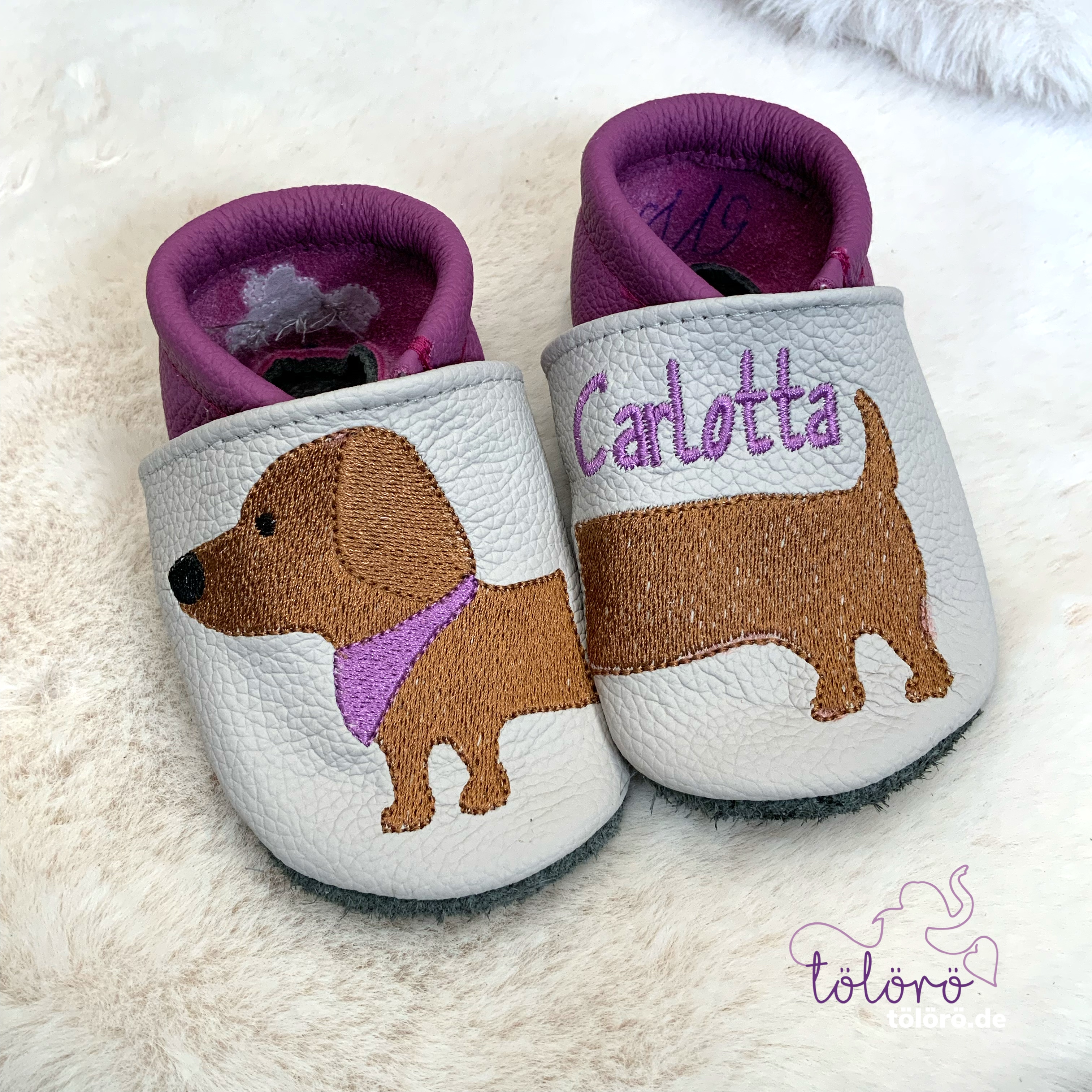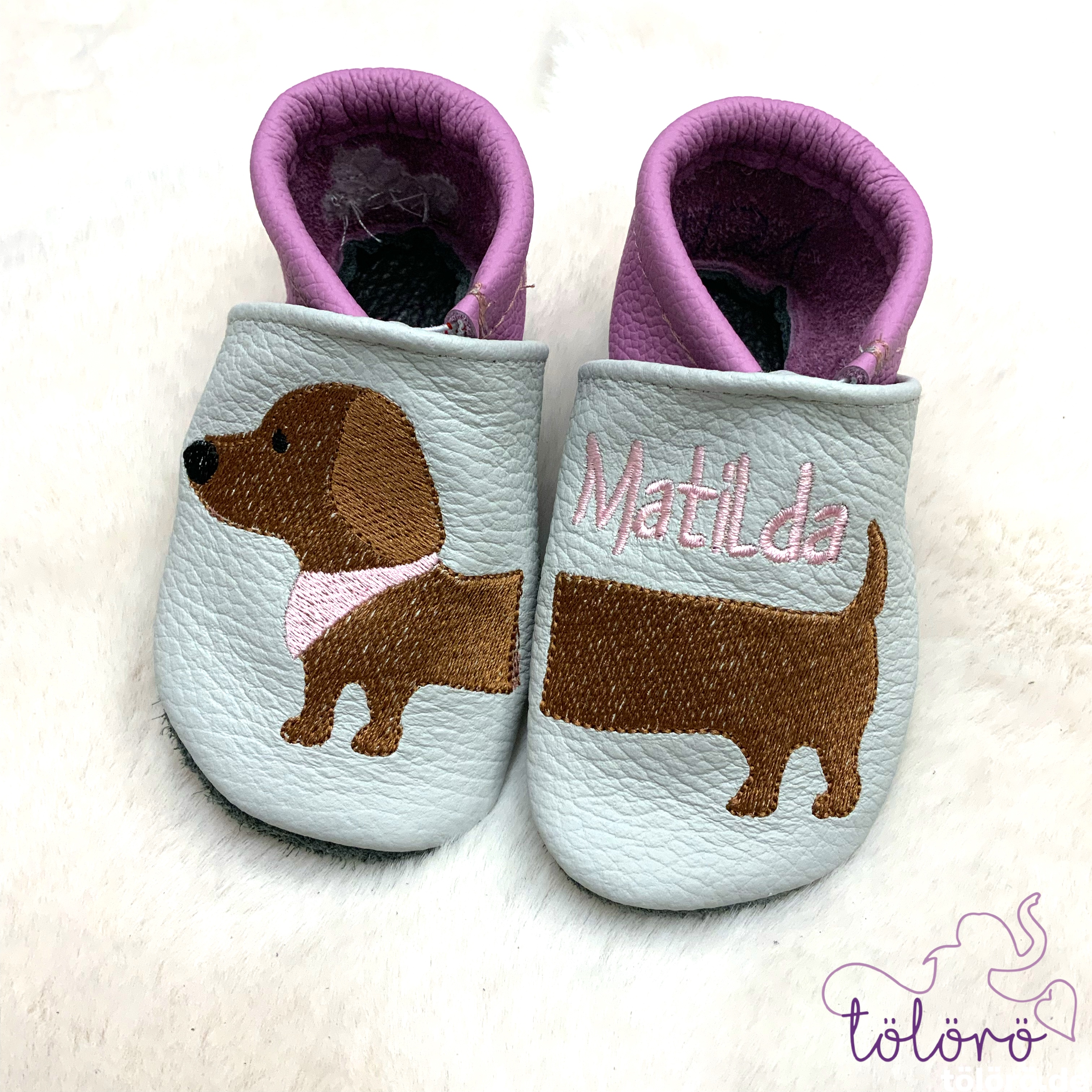 Unsere Lederpuschen mit Namen sind nicht nur praktisch, sondern auch ein emotionales Erinnerungsstück. Du bestimmst Farbe, Größe und Stickmotiv – wir setzen es in Handarbeit um.